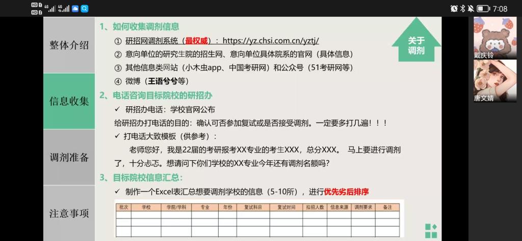 17保险二班张丹(西南财经大学保险专硕)在提到复试流程时,表示要注意熟练专业英语的应用,同时要区分好复试时是交流式还是非交流式。她以自己准备复试的经验为例,强调复试可以准备一个万能的英语话题,最好是以背诵朗读式的方式练习,以利于随时套入复试时的问题;随后,她告诉大家最好从专业、英语、以及报考院校的往年相关问题等方面进行准备;接着,她鼓励初试成绩没发挥好的同学们不要紧张,准备好场外因素;最后,她提到调剂要了解相关规定,并从学长学姐、微博超话、公司官网等多方面获取调剂的信息。