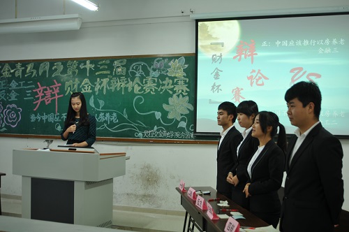11月14日下午,经过激烈的角逐,“财金杯”辩论赛终于迎来决赛。正方金融工程二班代表队与反方金融三班代表队,围绕“当今中国应不应推行以房养老”的辩题展开冠军争夺之战。财政公司党总支刘代成副书记、学团办主任杨佳妮老师、分团委书记兰丽娟老师,员工党支部书记文理、白玉、周琴老师莅临本次决赛。