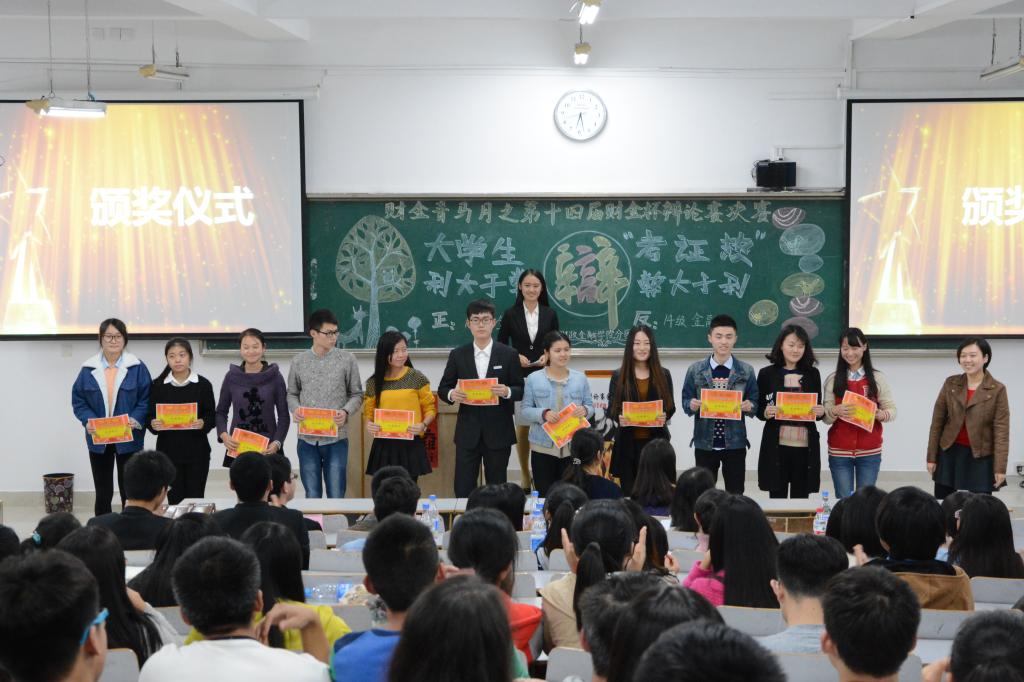 在评委简洁有力的点评之后,徐阔老师对本场比赛做了简短的小结,既表达了对活动参与度的鼓励,也表达了他衷心的祝愿。音乐声响起,比赛进入最激动人心的颁奖环节,范乐乐、余红霞老师为22位同学颁发了“优秀辩手”奖状,观众们亦见证了季军14保险一班和投资一班以及亚军金融二班的荣誉,最终,正方金融六班荣耀折桂,最佳辩手为反方四辩李楠。