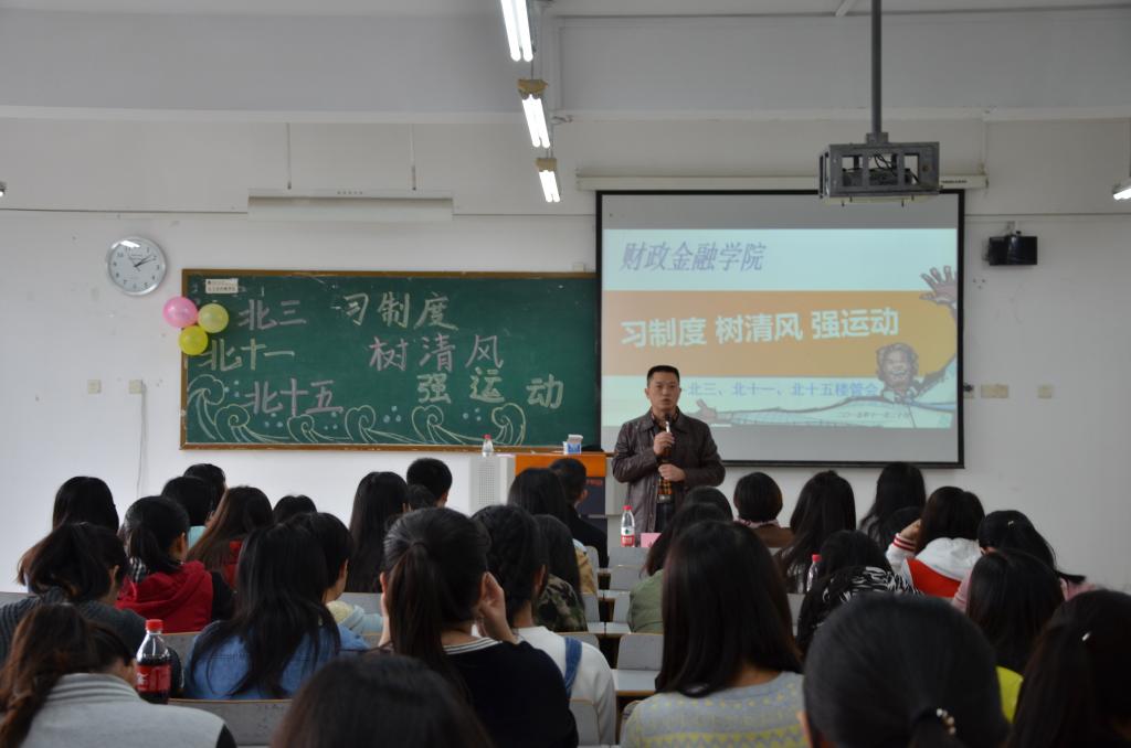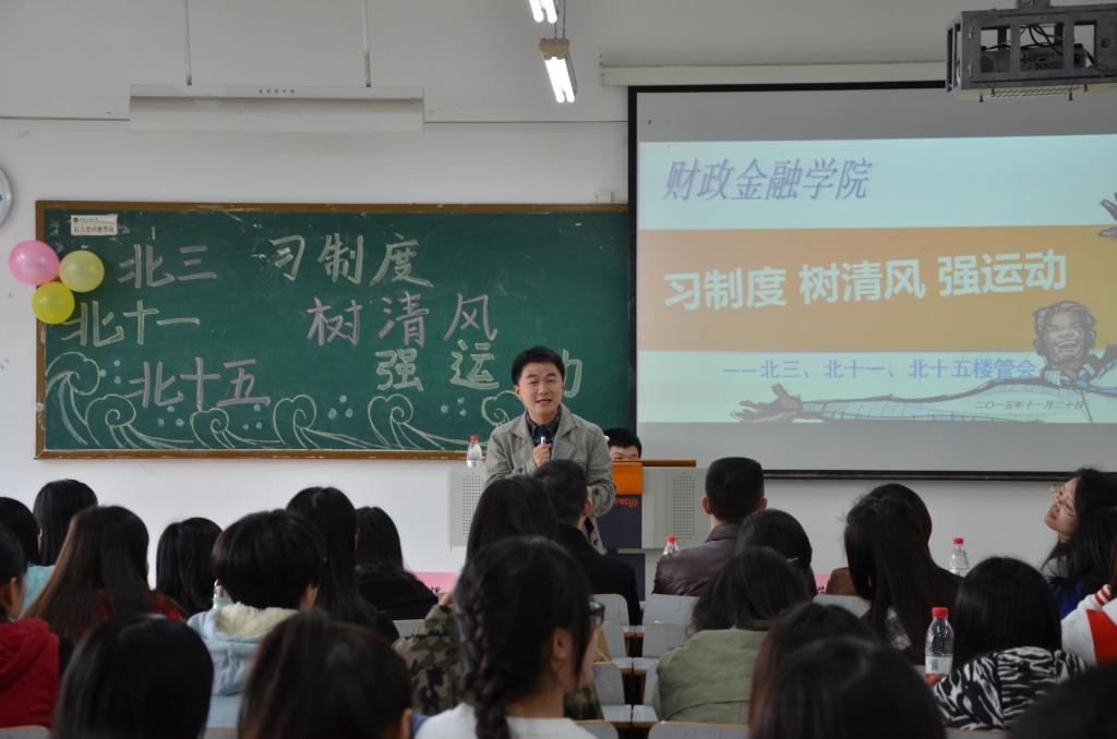 2015年11月20日,北三、北十一、北十五楼管会在7401教室和北操排球场联合举办了以“习制度、树新风、强运动”为主题的公寓特色活动。财政公司党总支副书记刘代成、分团委书记徐阔老师、员工第四党支部书记余红霞老师以及北三楼管会指导老师文理老师,北十一、北十五楼管会指导老师范乐乐老师出席活动。