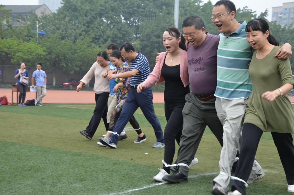 进行的第三个项目是四人五足,各代表队派出两男两女共4位教师肩并肩站成一排,相邻两人的脚用绳子绑在一起,跑动距离为25米,往返跑一次,最终成绩由所花时间少者获胜。本项目讲究队员之间的配合与协作,每个代表队都有自己的战略战术。看吧,有的代表队尽量选择身高差不多的队员参加,有的代表队把女队员夹在中间,有的代表队又把女队员放在两边,每个代表队都是齐心协力,快速地完成本项目的比赛,最后获得第一名的是投资代表队。