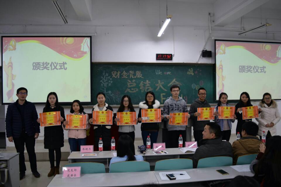 时光飞逝,又一个学期即将就此画上圆满的句号。为总结财金党服本学期的工作状况,也为了提升财金党服干部的工作积极性,表彰党服优秀团队和个人,2016年12月15日下午17点,财金党服在博智楼107举行了“财政公司党员服务站总结表彰大会”。出席本次大会的有财金党总支副书记刘代成、财金分团委书记徐阔、财金第一党支部书记文理、财金第三党支部书记范乐乐、财金学科竞赛指导老师余红霞、党服指导老师乔明月、财政公司党员服务站全体同学及其相关获奖代表。在财金党服干部彭枭、马丽君的主持下,本次财金党服总结表彰大会正式拉开帷幕。