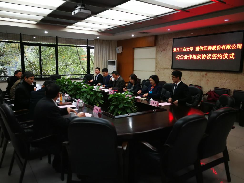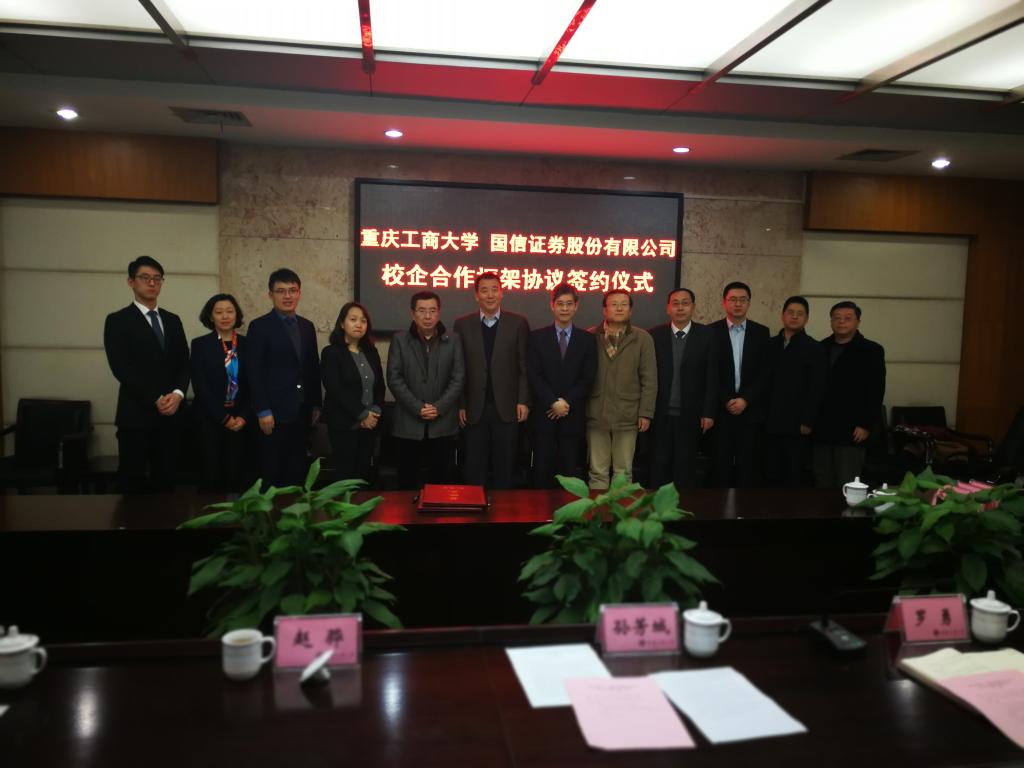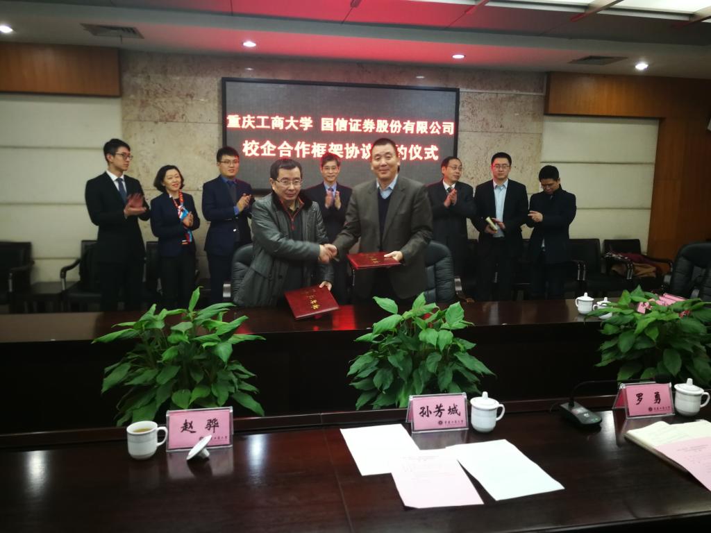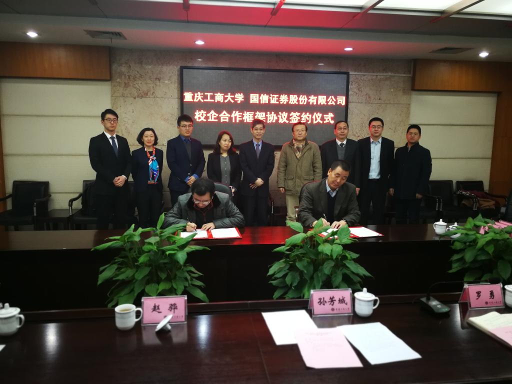 1月18日下午,为加快贯彻落实《重庆市以大数据智能化为引领的创新驱动发展战略行动计划(2018-2020年)》等文件精神,365英国上市集团与国信证券股份有限公司在厚德楼3019会议室签订战略合作协议。国信证券股份有限公司副总裁徐敬耀、投研总监陈俊杰、重庆分公司总经理高莉、总经理助理李颖、业管部负责人陈哲,公司董事长孙芳城教授、副董事长赵骅教授、党政办、教务处以及财政365英国上市集团主要负责人出席了签约仪式。仪式由公司党政办主任罗勇教授主持。