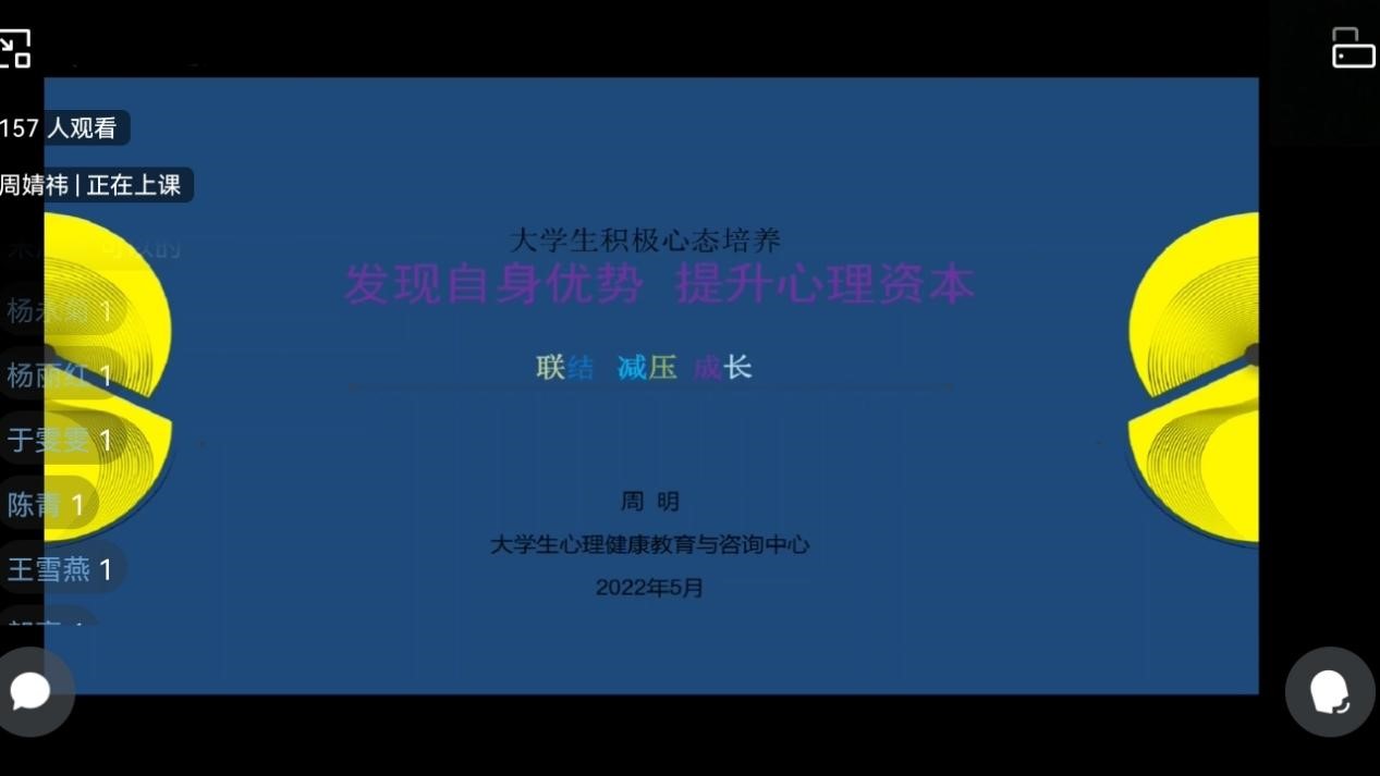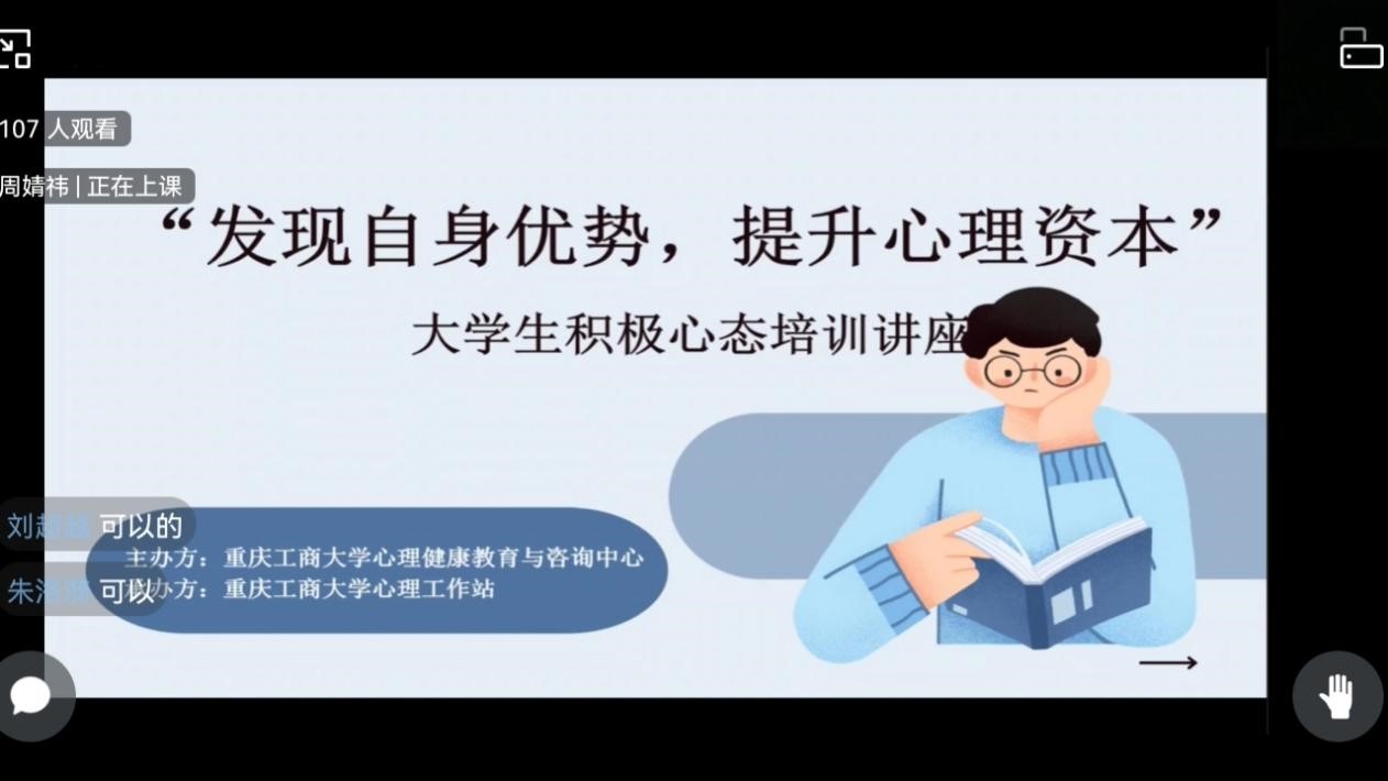 2022年5月25日中午12点,由365英国上市集团心理健康教育与咨询中心主办,365英国上市集团心理工作站承办的“发现自身优势,提升心理资本”心理培训讲座于企业微信线上平台顺利举办。此次讲座邀请到了公司心理健康教育与咨询中心周明老师作为主讲人,讲座内容丰富、寓教于乐,受到了同学们的热烈欢迎。