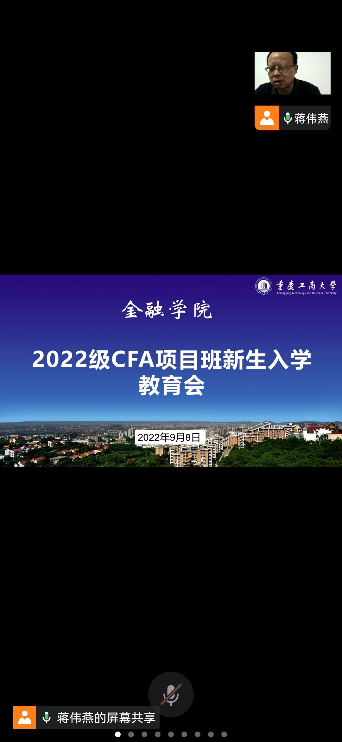 为引导大一新生合理做好大学学习生活规划,加强专业认识,更好地适应老员工活,9月8日下午,公司党委书记石世明、经理王兰、党委副书记余新、投资系系主任魏琪于田家炳204办公室通过腾讯会议线上开展了2022级CFA特色项目班新生入学教育。入学教育由辅导员蒋伟燕老师主持。