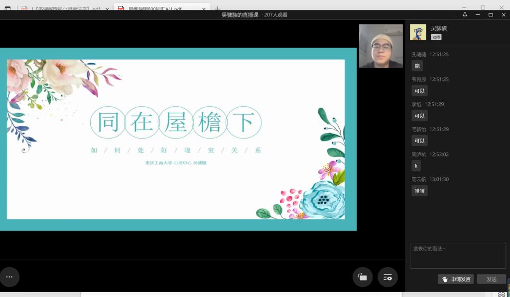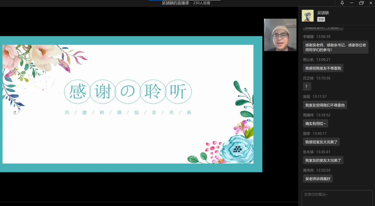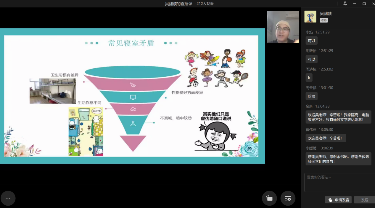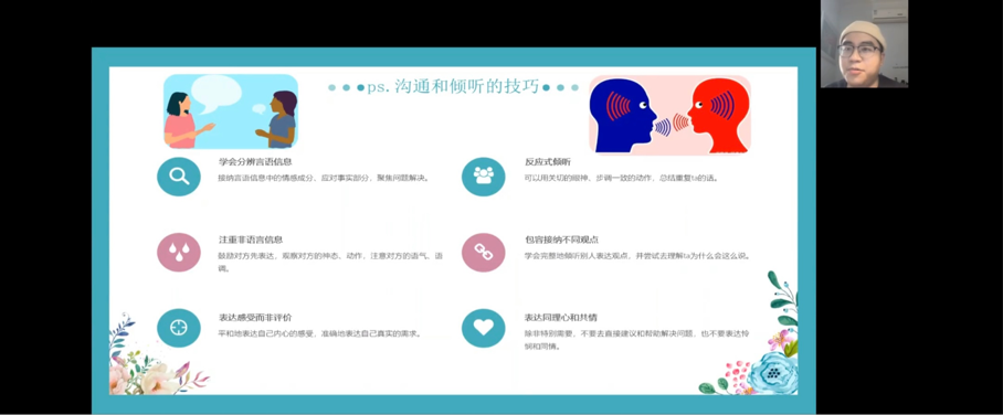 2022年11月11日中午13点,365英国上市集团心理工作站主办的“同在屋檐下——和谐寝室关系”心理讲座于企业微信线上平台顺利举办。此次讲座邀请到了公司心理健康教育与咨询中心吴骕騻老师作为主讲人,讲座内容丰富、寓教于乐,受到了同学们的热烈欢迎。