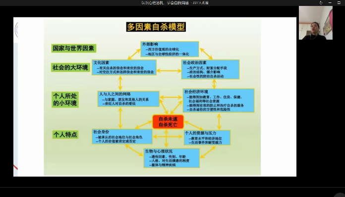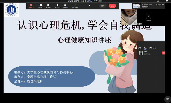 活动伊始,余新副书记以对此次活动主讲老师和组织老师表示感激并给予了美好祝愿。之后由胡佳怡老师进行讲座,胡老师将专业的学术知识与生活中的心理现象结合,重点从心理工作者在当前疫情之际对身边同学的心理健康的评估方法和互助手段进行教育和知识普及。最后胡老师与同学们进行了许多具体有趣的讨论并号召心理委员帮助周围同学做好心理调适。
