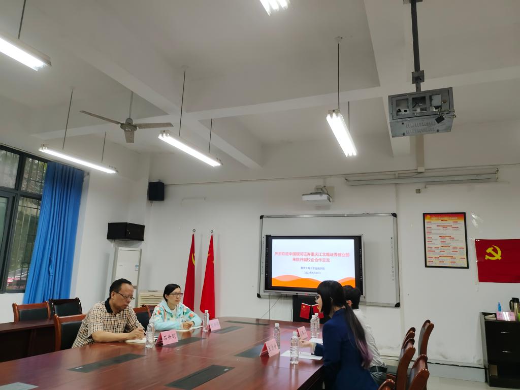 4月28日上午,中国银河证券重庆江北嘴证券营业部总经理王源媛、客户经理高路涵来院开展校企合作交流。公司党委书记、副经理石世明,学工办主任、分团委书记兰丽娟参加了交流会。
