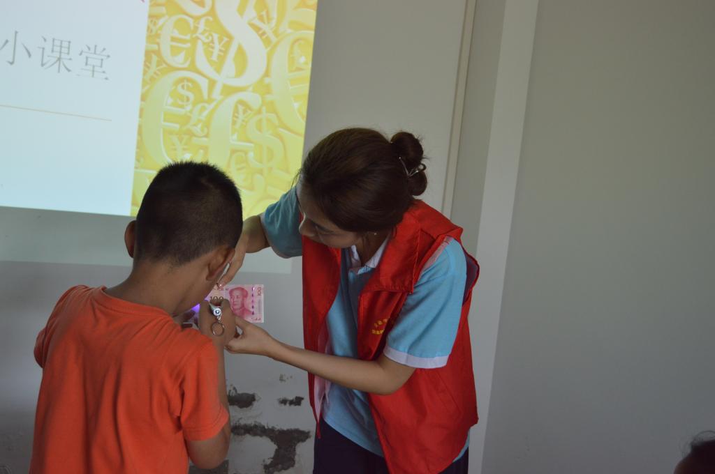 活动的第二项是真假人民币鉴别教学。本次教学以互动的模式,邀请小朋友们以实物接触的方式近距离学习人民币的防伪特征。实践团成员向小朋友们展示了人民币纸币的水印、光变油墨、凹印手感、隐形图案等多种防伪特征。通过触摸、观察,他们能够感受到真假人民币之间的差异。同时,本次活动还配备了验钞灯,让小朋友们通过使用这些小工具来进一步鉴别真假人民币。通过教学,提高小朋友识别假币的能力,增强安全防范意识,维护自身权益。
