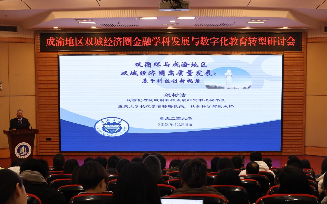 重庆大学社会科学部副主任、重庆市高等公司经济学类专业教学指导委员会主任委员姚树洁教授以《双循环与成渝地区双城经济圈高质量发展:基于科技创新视角》为题演讲,从新阶段国内外政治经济形势、“双循环”新发展格局与科技创新等方面阐释经济学类教育数字化转型的意义和实施路径。