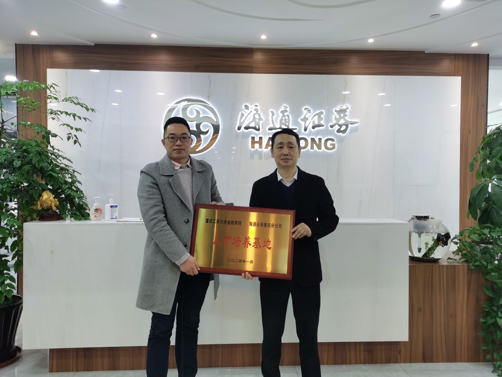 座谈会上,海通证券(重庆分公司)罗舟总经理对公司表示热烈欢迎,表示校企双方有着深厚的历史渊源,工商员工是海通证券科研管理队伍中不可或缺的力量,为企业发展作出了重要贡献。双方还针对公司人才培养、院企合作、实习就业、学科竞赛等多个方面进行了多维度、深层次的交流。公司党委书记石世明和副经理魏琪在发言中向海通证券一直以来对公司专业实习、毕业生就业等工作的支持表示感谢,公司高度重视与海通证券的合作,希望双方继续保持紧密联系,拓宽合作领域,深化、丰富在人才培养、学科竞赛、党建工作等方面深层次合作。最后,公司与海通证券举行了“老员工实习实践基地”与“人才培养基地”的授牌仪式。