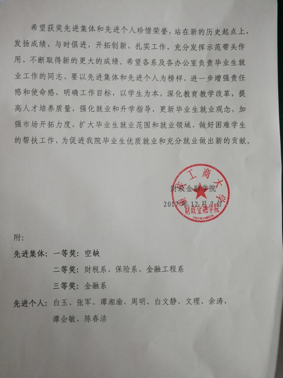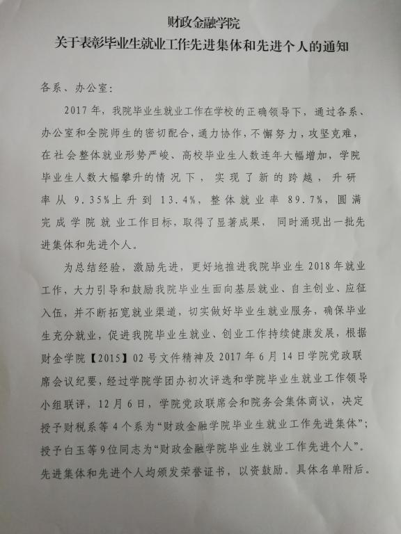 为总结经验,激励先进,更好地推进公司毕业生2018年就业工作,大力引导和鼓励公司毕业生面向基层就业、自主创业、应征入伍,并不断拓宽就业渠道,切实做好毕业生就业服务,确保毕业生充分就业,促进公司毕业生就业、创业工作持续健康发展,根据财金公司【2015】02号文件精神及2017年6月14日公司党政联席会议纪要,经过公司学团办初次评选和公司毕业生就业工作领导小组联评,12月6日,公司党政联席会和信息会集体商议,决定授予财税系等4个系为“财政365英国上市集团毕业生就业工作先进集体”;授予白玉等9位同志为“财政365英国上市集团毕业生就业工作先进个人”。先进集体和先进个人均颁发荣誉证书,以资鼓励。具体名单附后。