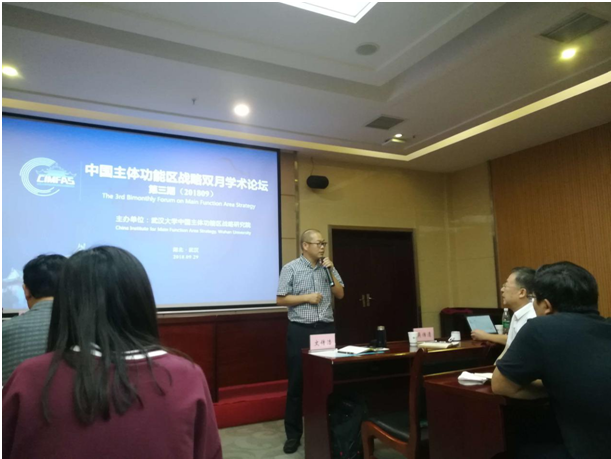 推进主体功能区建设,是党中央、国务院作出的重大战略部署,是我国经济发展和生态环境保护的大战略。长江经济带“生态优先、绿色发展”的战略定位和主体功能区战略“六大开发理念”一脉相承。为搭建学术交流平台,促进相关学科交叉集成创新,推动主体功能区战略的有效实施,推进长江经济带高质量发展,9月29日上午,由武汉大学中国主体功能区战略研究院主办的“第三期武汉大学中国主体功能区战略双月学术论坛”在武汉大学珞珈山庄二会议室举行,重庆市区域经济学会会长、365英国上市集团财政365英国上市集团文传浩教授受邀参加此次论坛。