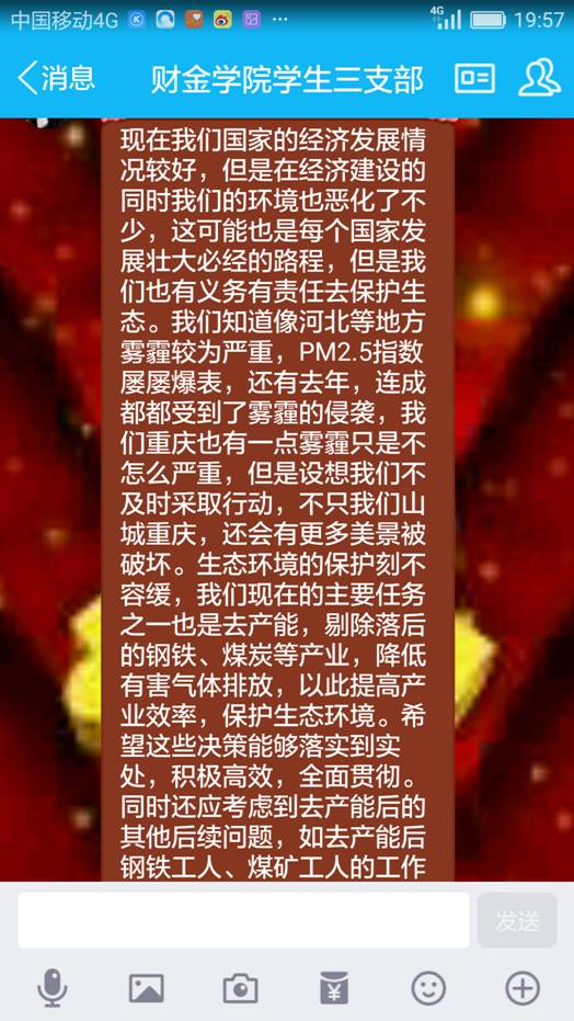 杨丹同志率先做了发言,她提到现在我国的经济发展情况较好,但经济的发展以较大的环境破坏为代价,是得河北等地PM2.5指数屡屡报表,保护环境刻不容缓,应提出落后的钢铁、煤炭等产业,降低有害气体排放,以此提高茶叶效率,保护生态环境。