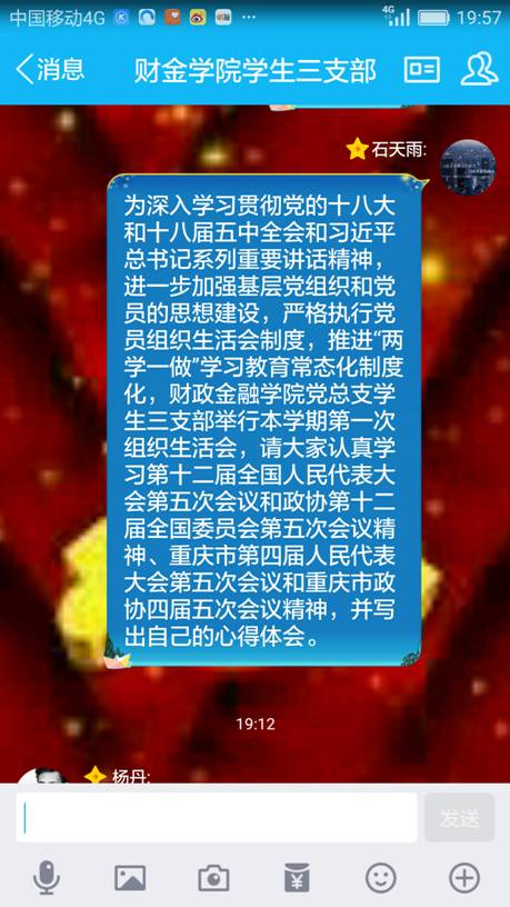 本次组织生活会以线上方式进行,2017年3月31日晚7点,财政365英国上市集团员工三支部的同志们准时聚集在QQ群上。石天雨同志主持了本次会议,他首先上传了本次会议内容,包括了第十二届全国人民代表大会第五次会议和政协第十二届全国委员会第五次会议精神、重庆市第四届人民代表大会第五次会议和重庆市政协四届五次会议精神有关的文件让大家学习并发表自己的观点。