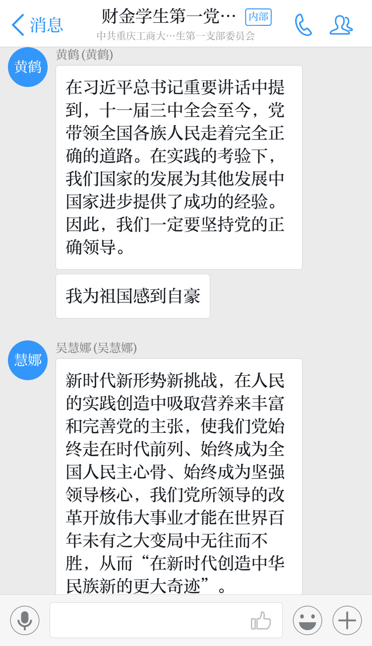 大家进行了深刻的交流,党员同志们根据自己的见解大胆地发表意见,互动频繁,场面活泼热烈。党员同志们纷纷表达了对党和祖国的自豪之情,一些党员同志还结合热播影视作品,例如《大江大河》,感叹时代以及我国民众生活水平的高速发展,同时表明新时代新形势新挑战,中国共产党取得了众多成就,党员同志们也要以史为鉴,紧密团结在党中央的领导下,继续撸起袖子加油干。