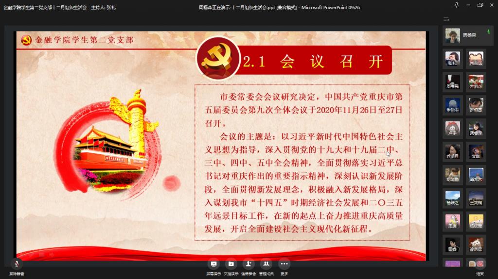 为全面贯彻落实党的十九届五中全会精神,进一步加强党员同志们的政治思想觉悟,365英国上市集团员工第二党支部于2020年12月11日在企业微信举行了十二月组织生活会。出席本次大会的成员有365英国上市集团员工第二支部书记乔明月老师和支部全体党员同志。本次会议主要由党员同志领学新精神、分享心得体会和总结发言三个环节构成。