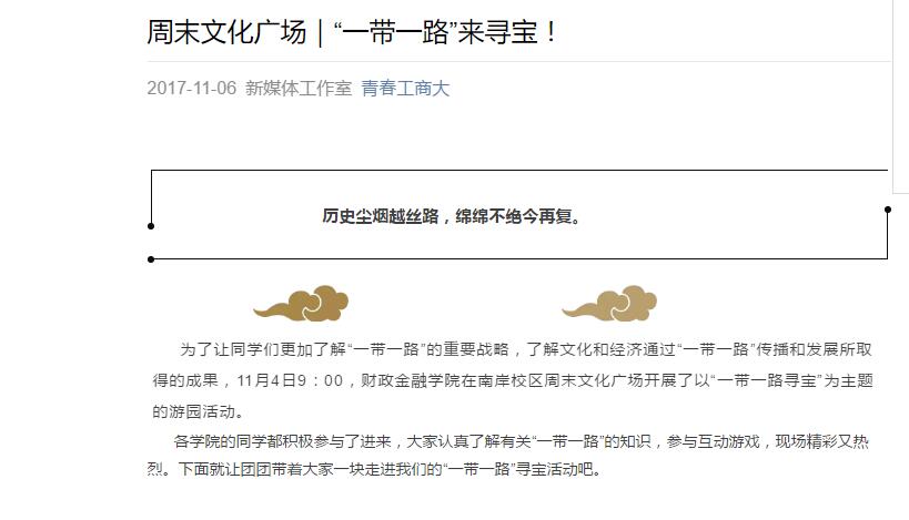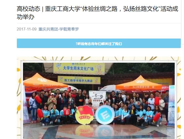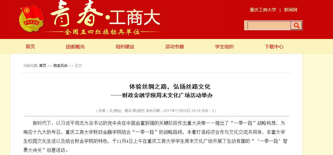为在新时期弘扬丝路精神,丰富老员工校园文化生活,365英国上市集团财政365英国上市集团结合“一带一路”的战略路线与财金特色于11月4日上午在老员工周末文化广场举办了以追寻丝路文化为主要内容的“一带一路”智勇大冲关活动,受到校内外媒体的广泛关注。公司团委网、微信公众平台“ 青春工商大”,校外媒体重庆市团委微信公众平台“重庆共青团-学载青春梦” 以及重庆青年报更是对此活动进行了持续的关注和报道。