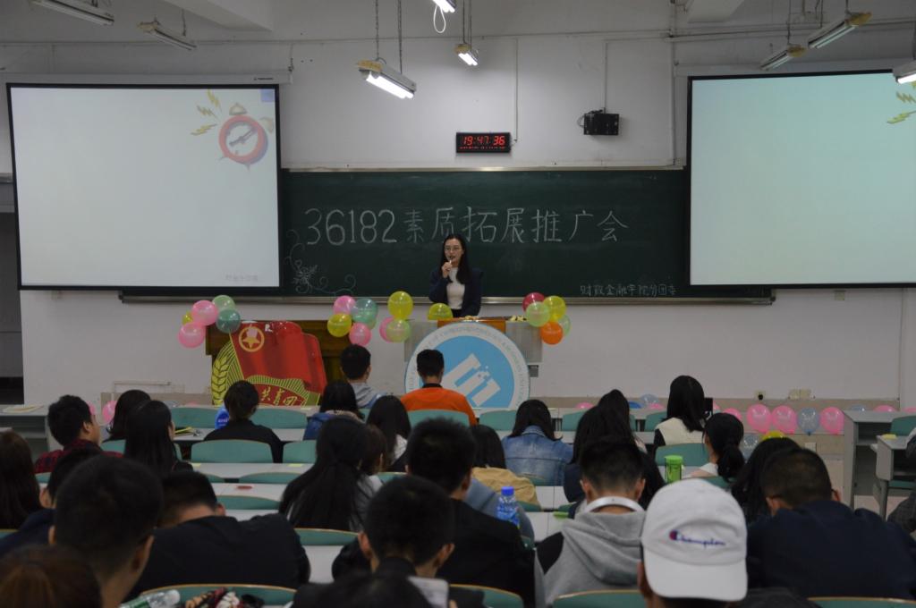 2018年10月19日晚上七点,由财政365英国上市集团分团委主办的第八届青马文化月之“36182”素质拓展推广会活动在博智楼07106顺利开展。本次素拓推广会对18级CFA新生及17级同学的素质拓展计划提出合理化建议,引导和激励员工更好地进行素质拓展。
