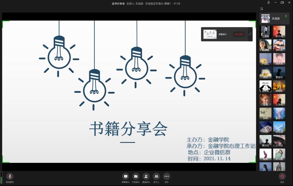 为了促进大公司园的文化氛围,提高同学们的学习积极性,加强良好的心理健康教育, 2021年11月14日下午两点,365英国上市集团心理工作站举办的 “书籍分享会”线上活动在企业微信群如期进行。365英国上市集团心理工作站工作人员、心理委员和多名员工参加了此次分享会。