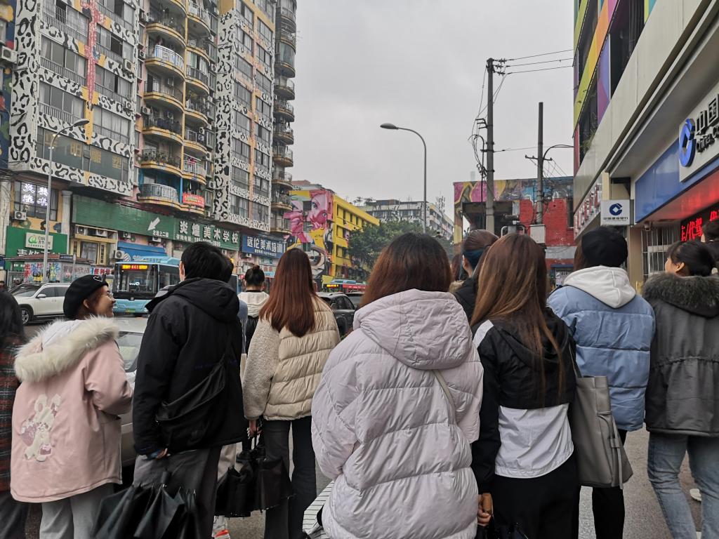事前,同学们通过媒体报道、政策文件宣传等方式了解了“五座城”的建设定位:中部历史母城、东部生态之城、西部科学之城、南部人文之城、北部智慧之城,对城市功能区的提档升级充满期待。本次参观的九龙半岛艺术湾区,是长江文化艺术湾区的重要部分,同学们赴九龙半岛规划馆参观调研九龙半岛的具体布局和详细功能分区;围绕四川美术公司和黄桷坪涂鸦一条街及其周边区域感受文创和文旅开发成果。同学们一路前行一路赞叹,感受着扑面而来的艺术的气息。黄桷坪的川美老校区门外,一个由红色墙砖和不规则曲面的“蜂巢”形建筑,透过玻璃依稀可见陈列的画作。这个在建的艺术长廊是黄桷坪涂鸦街提升改造项目的一部分,计划沿街改造全长约1200米。漫步街道,同学们身处在艺术的海洋中,楼栋的彩绘已焕然一新,不少同学感叹,在色彩的构造下,居民楼好似都拥有了独特的个性。