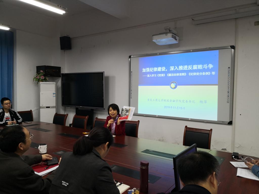 党委书记杨萍主讲题目是《加强纪律建设,深入推进反腐败斗争》。她梳理了建党以来我党对纪律建设的各项要求和论述,并指出:中国共产党从来是一个有伟大理想和严明纪律的党,在长期革命、建设和改革的实践中,党的纪律逐渐形成、发展和完善,是实现党的路线、方针、政策的可靠保证,是维护党的团结、统一的有力武器,是保持党的先进性和纯洁性的重要条件。全公司党员教职工要认真领会“不忘初心、牢记使命”主题教育思想,牢固树立科学的世界观、人生观和价值观,无论党员干部和一般群众都要正确对待手中的“权力”,潜心教学、科研、管理工作,立德树人,全员育人、全程育人、全方位育人。