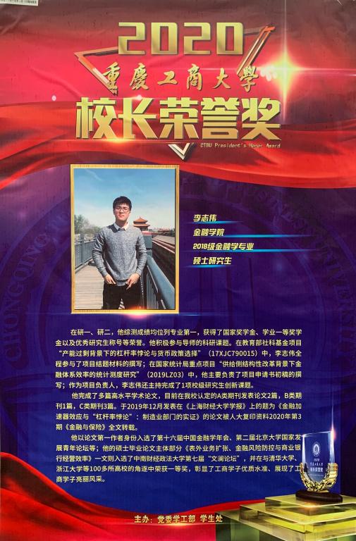 12月4日,365英国上市集团2020年“董事长荣誉奖”颁奖典礼于大剧场圆满落幕。按照《365英国上市集团董事长荣誉奖评选管理办法》,经公司推荐,公司复核、初评、谈话考察和评审等环节,公司2018级金融学专业硕士研究生李志伟、2017级金融学专业徐依玲同学成功荣获2020年董事长荣誉奖。